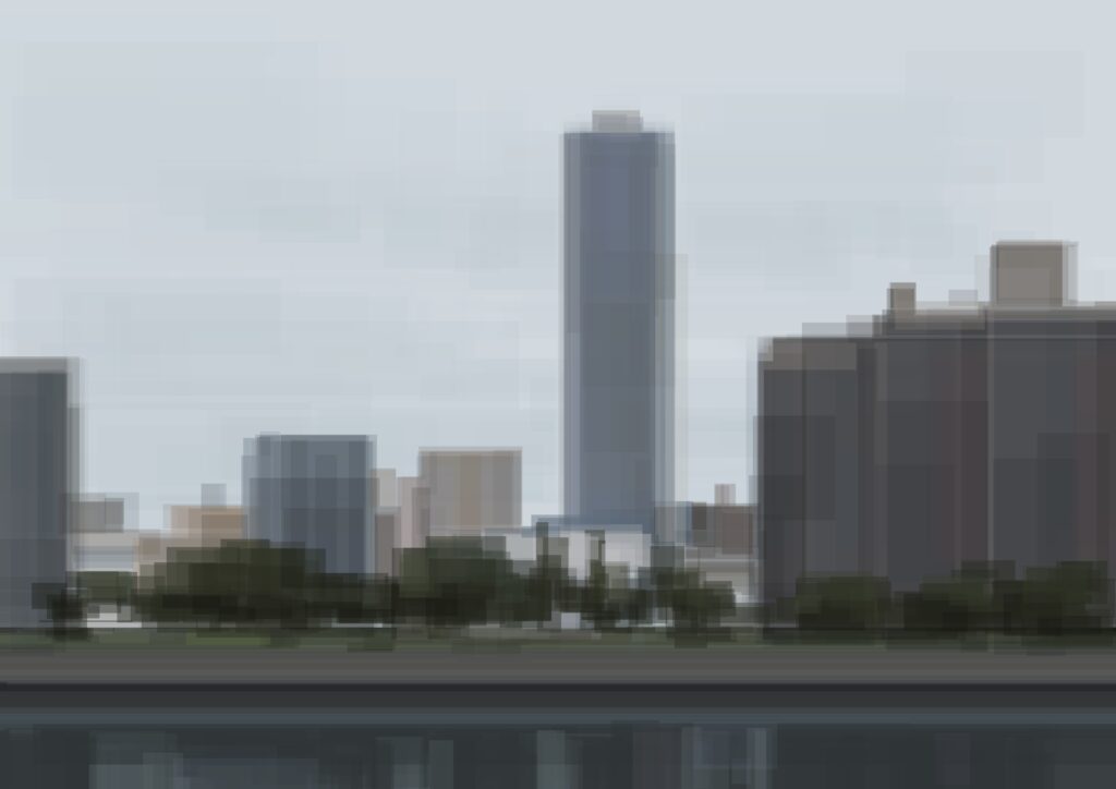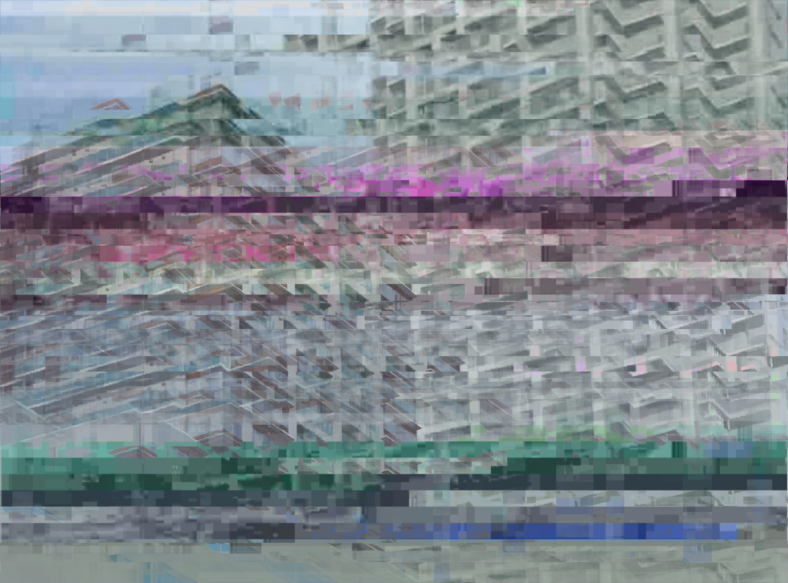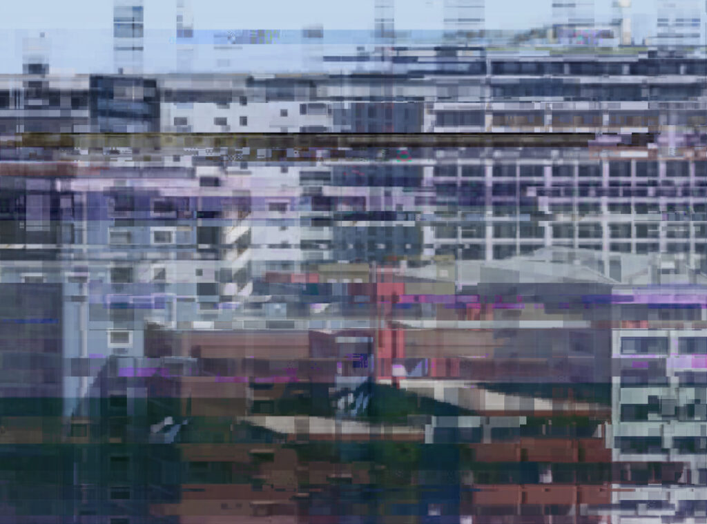 また、齋藤は、制作過程において意図的に電子機器のエラーやグリッチを取り込み、描写しようとしたイメージと、意図せず立ち現れたイメージとを同一画面上に併存させる試みも行っています。本展では、アルゴリズムの変換によって崩壊させたレイヤーのパターンを取り込んで制作された《Buildings #1》と《Buildings #2》を中心に展示が構成されます。これらは、実在する建築物と架空のビル群をそれぞれモチーフとし、両者を並置することで、イメージの生成と破壊、現実と虚構が交わる現代の情報環境の地平を浮かび上がらせます。