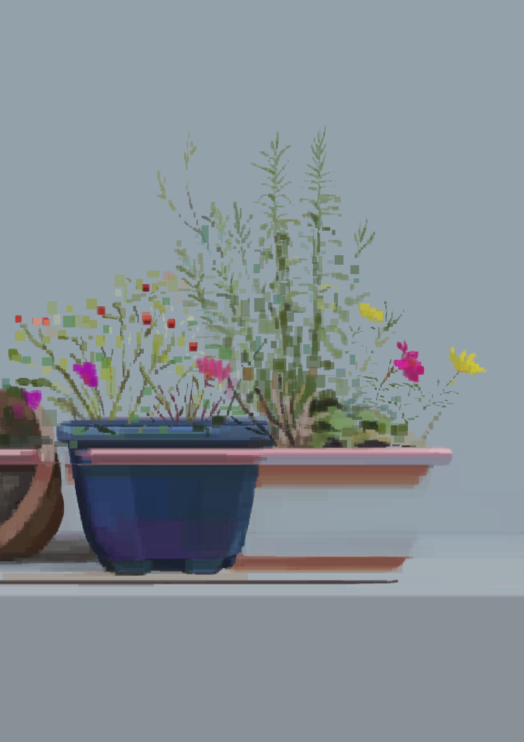齋藤の制作手法の特徴のひとつに、ペイントソフトの四角形ツールを用いた独自の描画プロセスが挙げられます。色彩や透明度、大きさを微細に変化させた、多数の四角いレイヤーを幾重にも集積して形成されたその図像は、一見すると解像度の粗いデジタル写真のようにも映ります。しかしそれらは、「画家」としての鋭敏な造形感覚によって、色彩や構図、細部の表情に至るまで緻密に構築されたデジタル・ペインティングとしての「絵画」なのです。