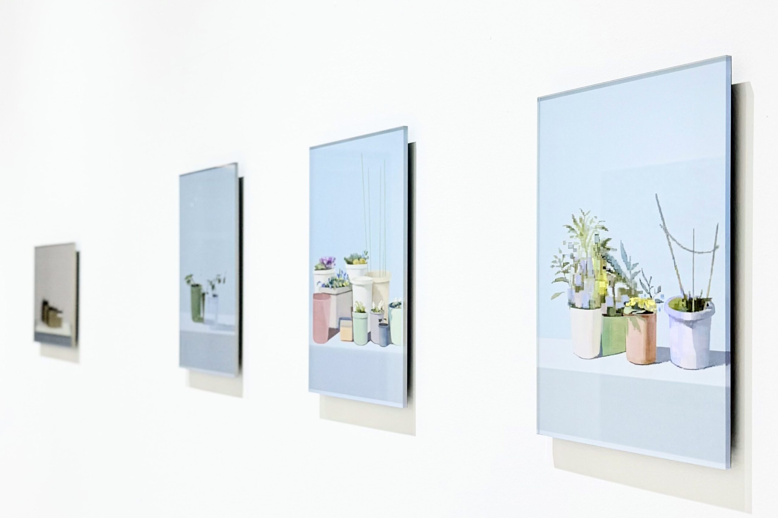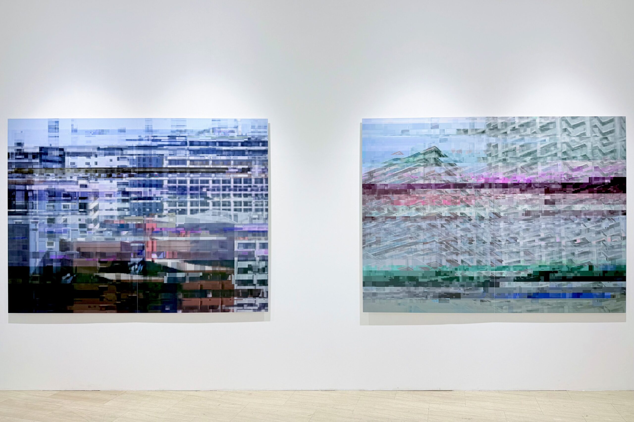 一見解像度の粗いデジタル写真のように映る作品は、ペイントソフトの四角形ツールを用いた独自の絵画プロセスにより、色彩や透明度、大きさを微細に変化させ、多数の四角いレイヤーを幾重にも集積して形成されたデジタル・ペインティングです。
